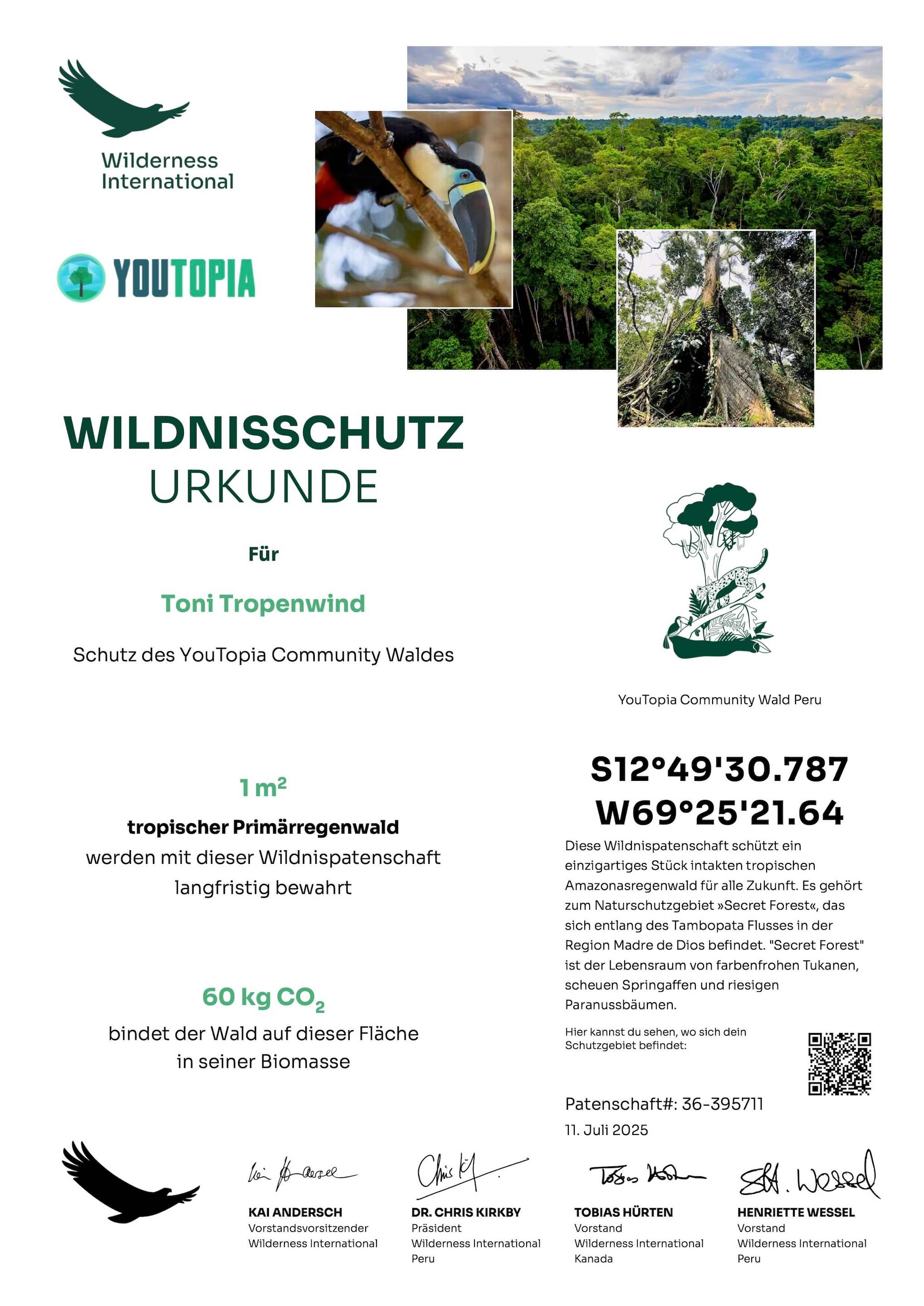 Immediately after your donation, you will receive a personalized certificate about the piece of wilderness you have protected - with the exact geocoordinates. It also makes a great gift!