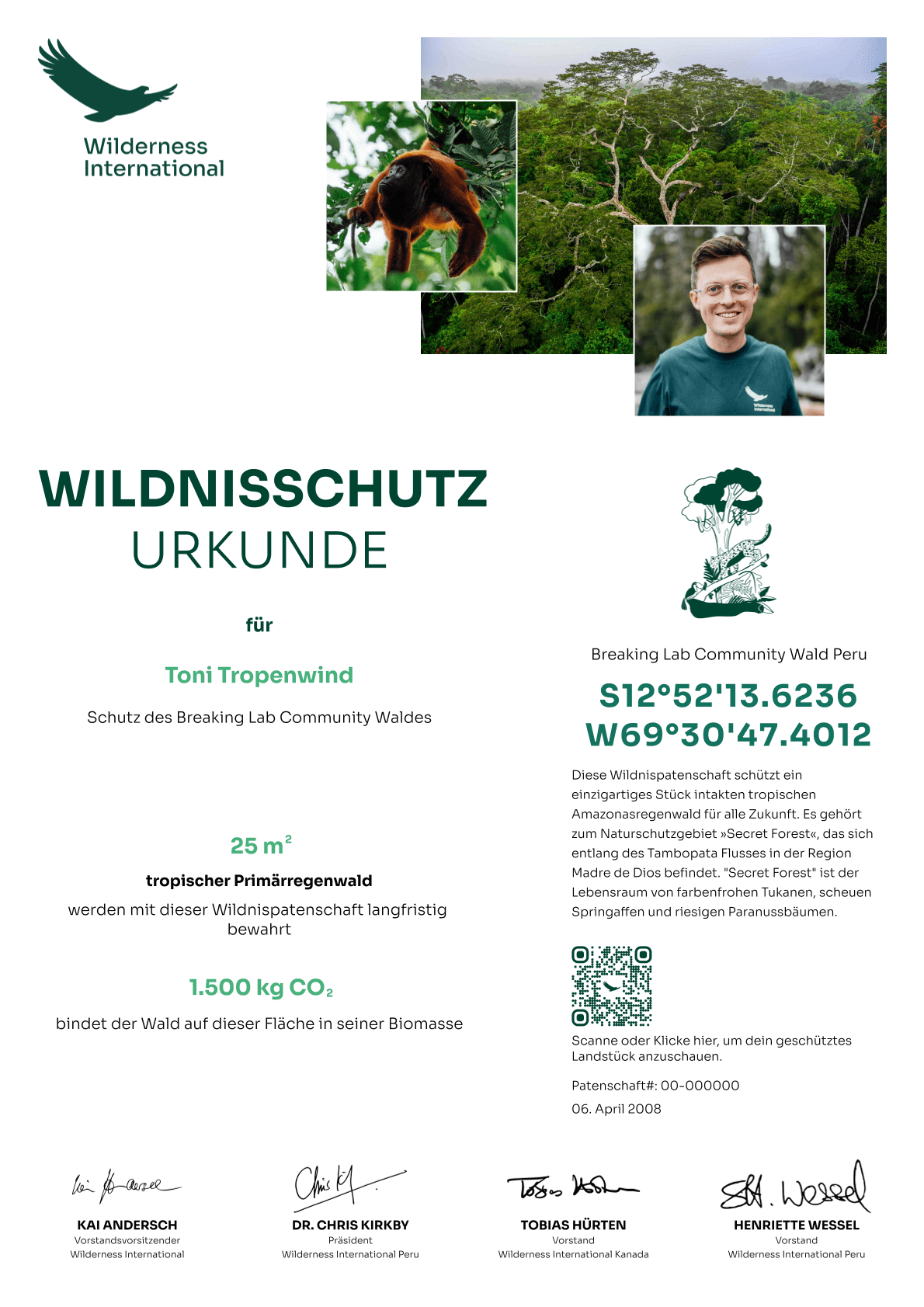 The foundation, which is based in Peru, Canada and Germany, purchases legally secure wilderness areas and protects them for the future. The purchases are refinanced through donations, which ensure the long-term protection of the areas, supports environmental education projects, and research into CO2 storage and biodiversity.
