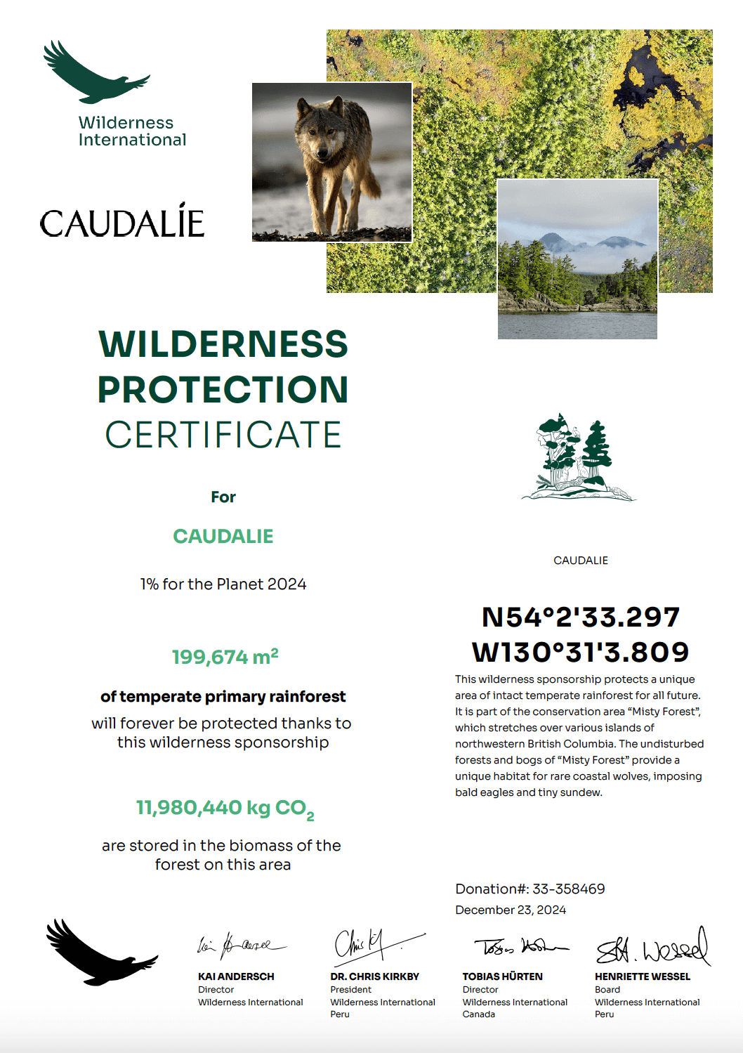 What particularly impressed Caudalie about Wilderness International was the transparent and concrete use of the donations: 1€ donation protects 1 m2 old-growth forest - forever. Donors receive a certificate with the geo-coordinates and an aerial photo of the protected forest area as well as a tax-deductible donation receipt.