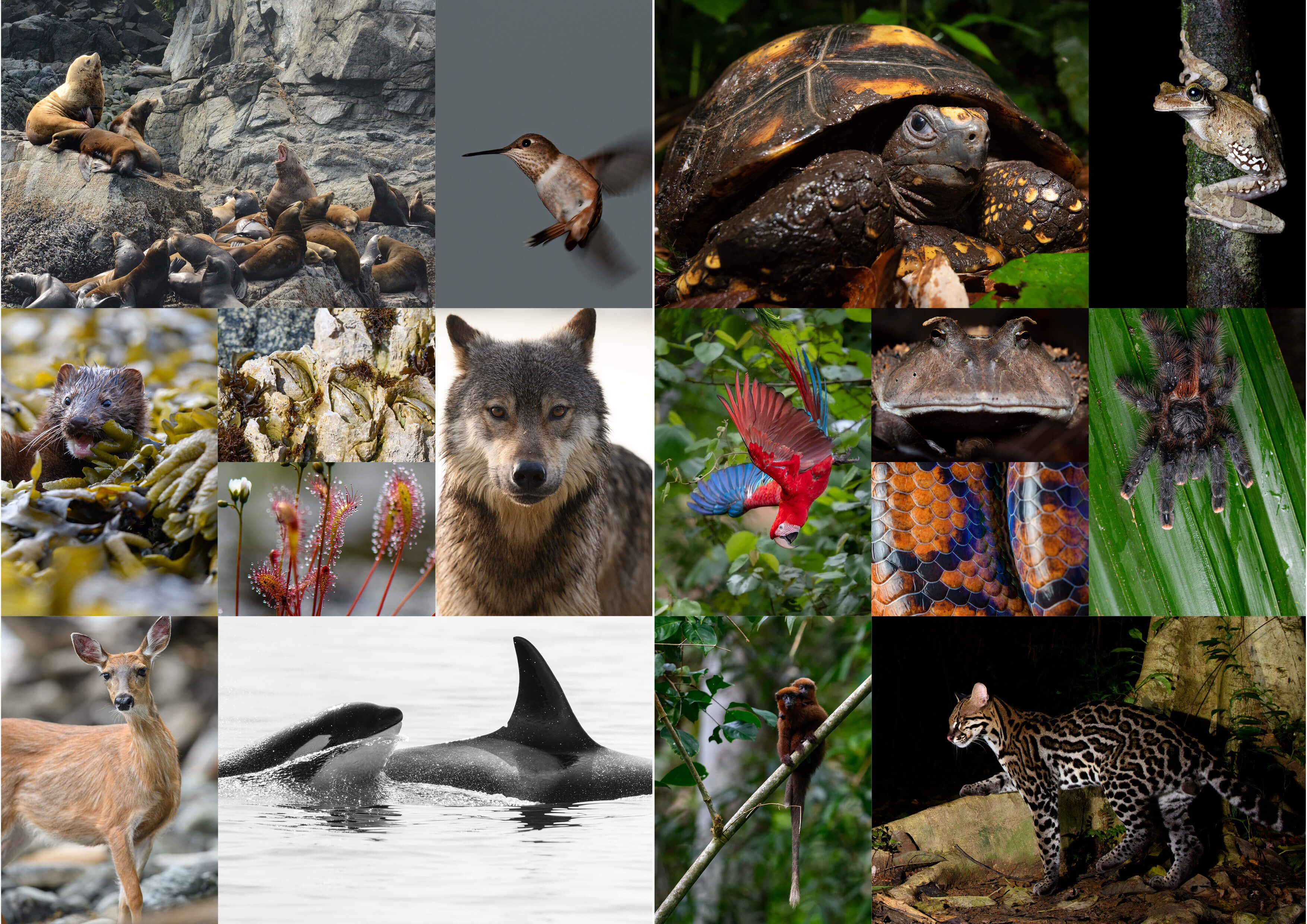They still exist in Canada and Peru: thousand-year-old giant trees, salmon-fishing grizzly bears and howling wolves in the temperate rainforest of the north; liana-clad jungle giants, mysterious jaguars and playful monkeys in the tropical rainforest of the south.
