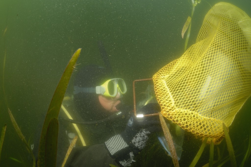 At lunchtime I met Ross, who was chiseling the eelgrass chip out of the brick. Later I accompanied the eelgrass team again, this time collecting the eelgrass itself along a survey tape in 13 degree Celsius water and two meters of visibility for closer examination.