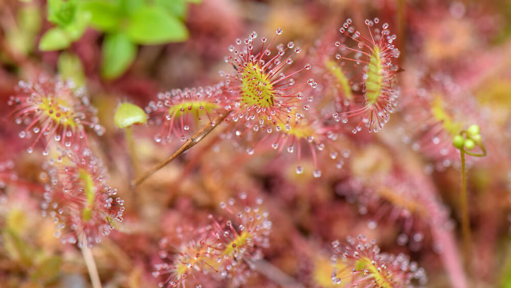 Their otter castle, inhabited by many otters and passed down from generation to generation, is hidden inconspicuously here. The gnarled old trees provide them with cover. They defy the harsh weather of the north coast. Embedded in soft layers of ancient peat moss, rare long-leaved sundew grows, its nectar drops glistening in a rare ray of sunshine. In the stillness of the moor, it lures flies into its trap with its sticky tentacles.