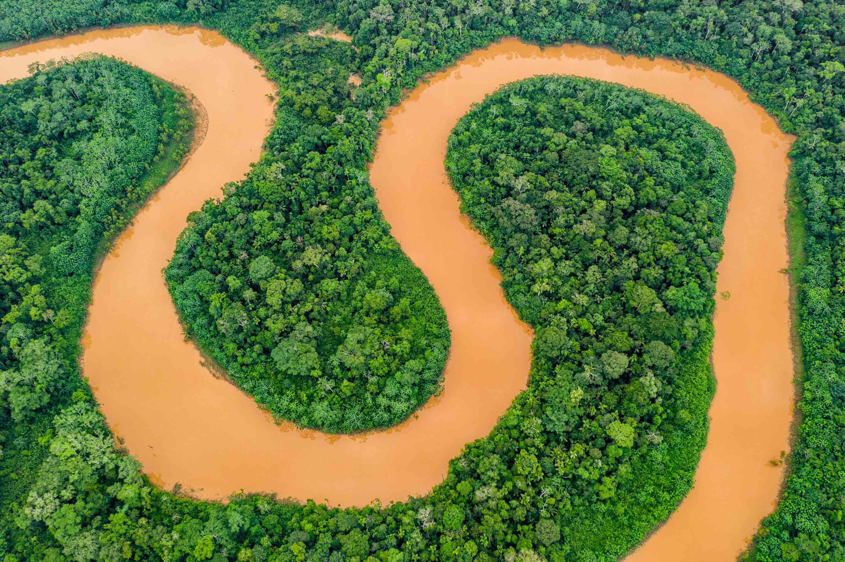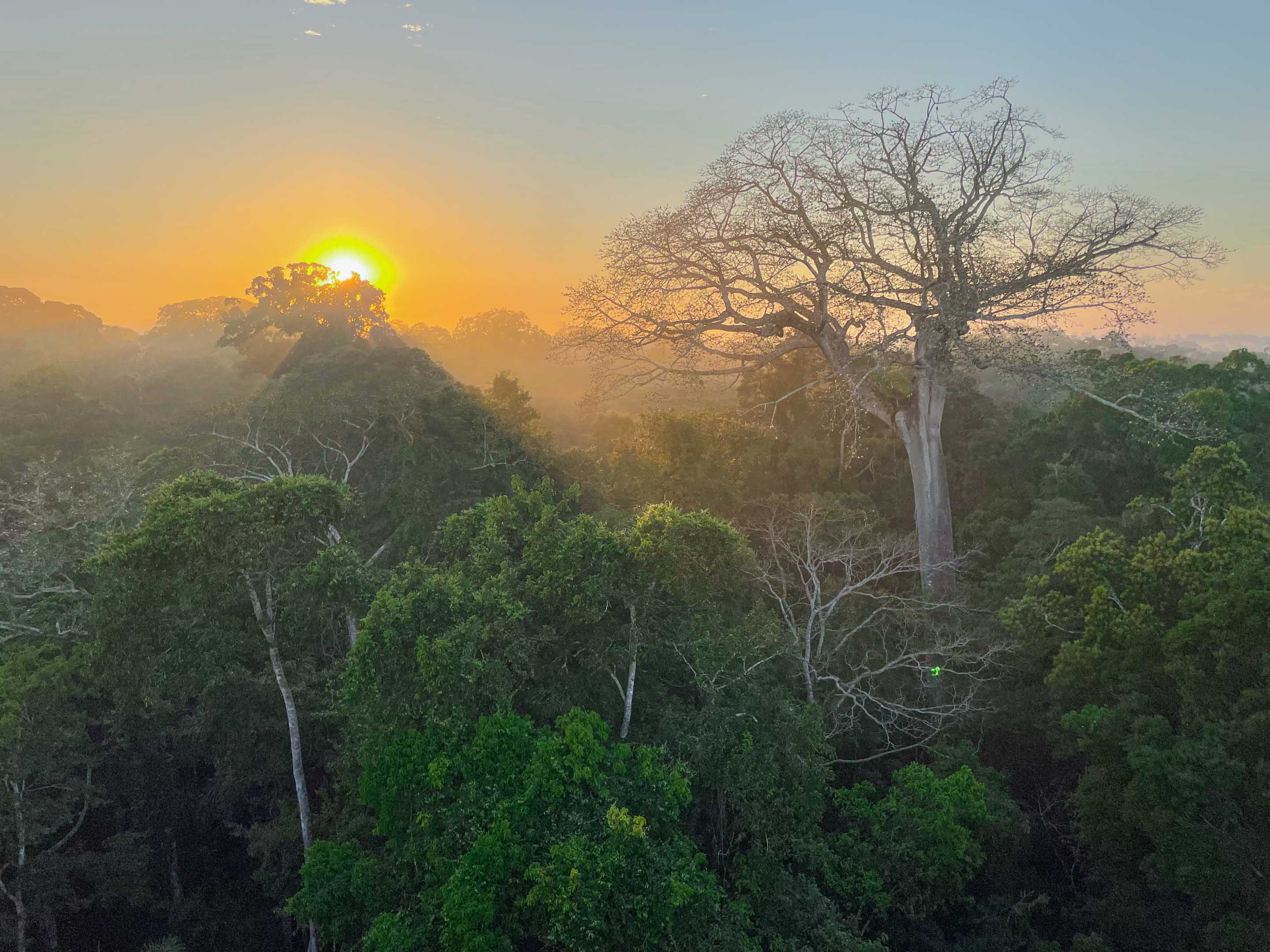 When the sun rises over the forests along the Tambopata River, the forest begins to breathe. Warm mist rises above the treetops, breaking the sunlight into warm colors of red.