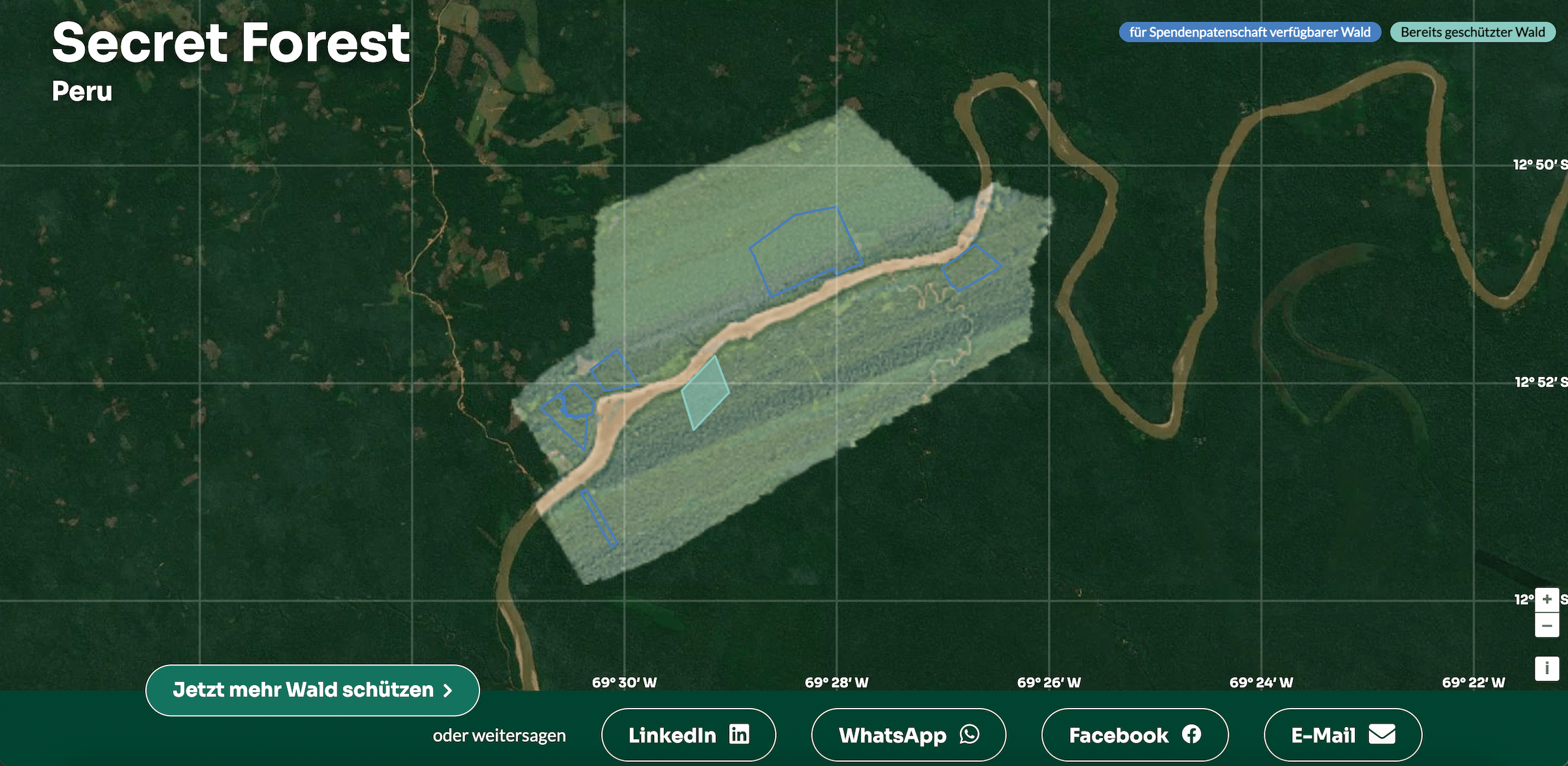 On the online map you can see all the areas that the Secret Forest currently covers, as well as their location on the globe. There you will find our current aerial photos and you can also see which areas are already permanently protected through sponsorships.