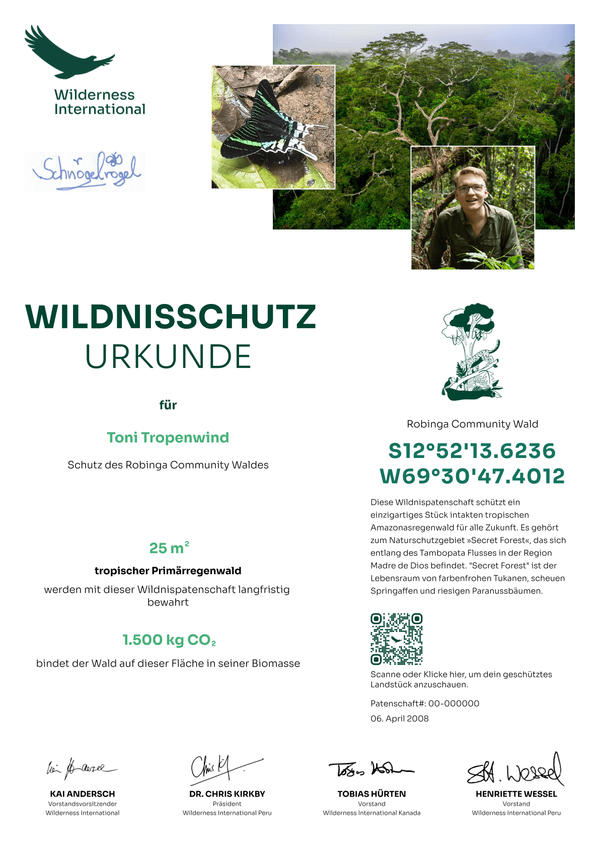 You can download the certificate with the geocoordinates of your protected area directly after payment. It will also be sent to you by e-mail, together with a link that shows you your personal protected area down to the square meter.