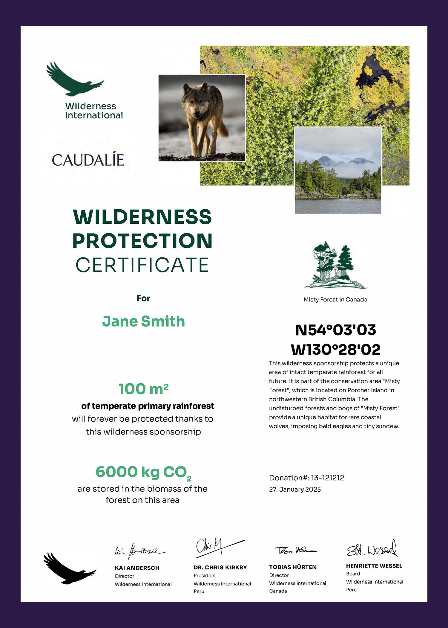 You will receive a personalized certificate of the piece of wilderness you protected immediately after your donation.