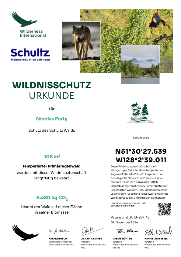 The Schultz family business has been manufacturing furniture for over a century - responsibly towards the environment. Schultz Möbel offsets its emissions from manufacturing and daily office operations with wilderness protection. In addition, Schultz donated a complete set of office equipment to Wilderness International.