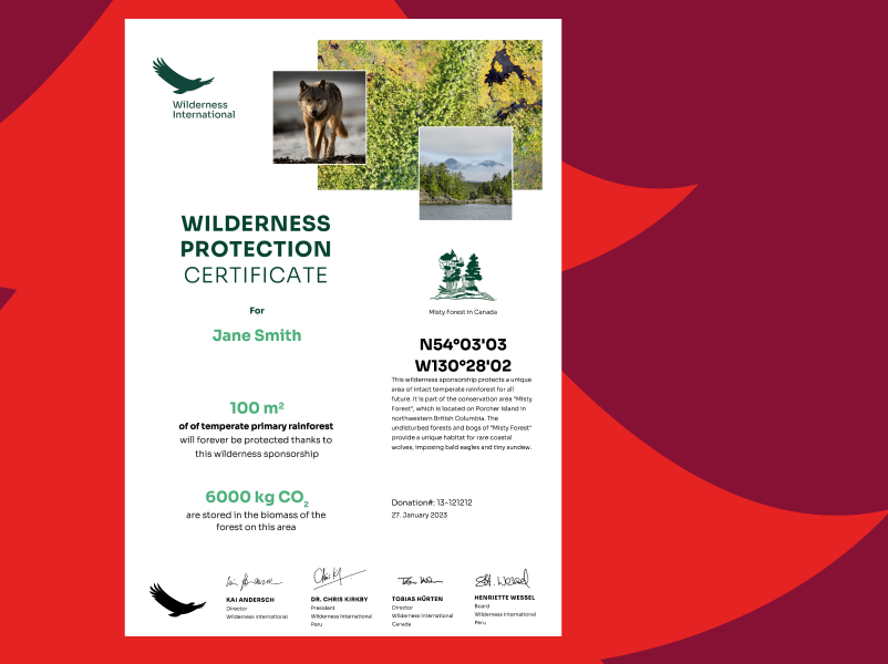 You will receive a personalized sponsorship certificate for your piece of protected forest, where you can enter the name of the person receiving the gift. On the certificate, you will find the exact geo-coordinates of the protected forest in Canada. This way, you can track exactly which piece of unique wilderness you have preserved together forever.